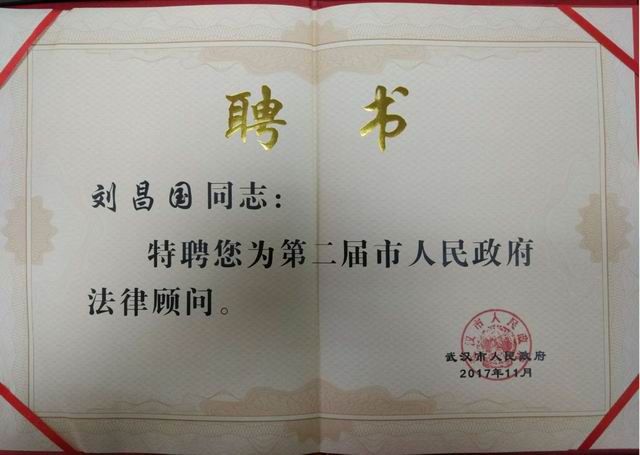十一月二十九日,在武汉市人民政府第二届政府法律顾问聘任仪式上,市政协常委、湖北律协副会长、武汉市律协副会长、我所主任刘昌国被市政府续聘为第二届政府法律顾问。当刘主任从万勇市长手中接过寄予了人民对建设满意法制政府重托的沉甸甸地续聘证书后,深感责任重大,使命光荣。他表示:一定要铭记习近平总书记关于全面依法治国的治国方略,绝不辜负市政府和全市一千多万市民的殷切嘱托,一定会切实担负起法律工作者的社会责任,主动担当,积极作为,竭尽全力地为建设法制政府、实现良法善治进言献策,为武汉市聚焦长江主轴建设,打造长江新城,尽快实现现代化、生态化、国际化大都市的梦想,贡献自己的全部才智和力量。